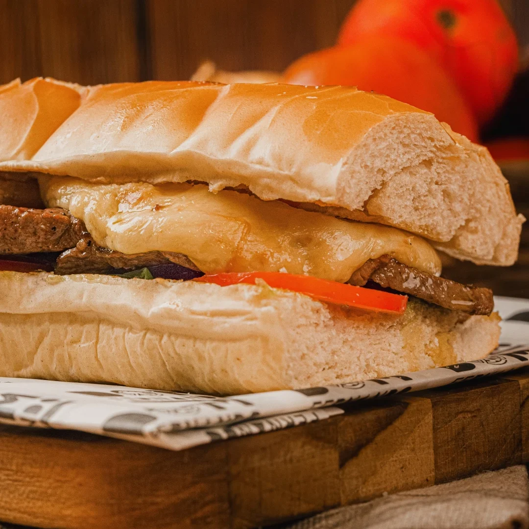 Pão baguete, lascas de picanha grelhada, com muito queijo provolone, molho chimichurri, tomate, cebola roxa e rúcula.