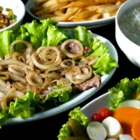 Bife de Filé Mignon acebolado, arroz branco, batata frita, feijão de caldo, e salada.