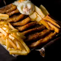 Picanha na chapa, salada, arroz branco, feijão tropeiro, ovo frito, mandioca frita, banana da terra frita, e batata frita.