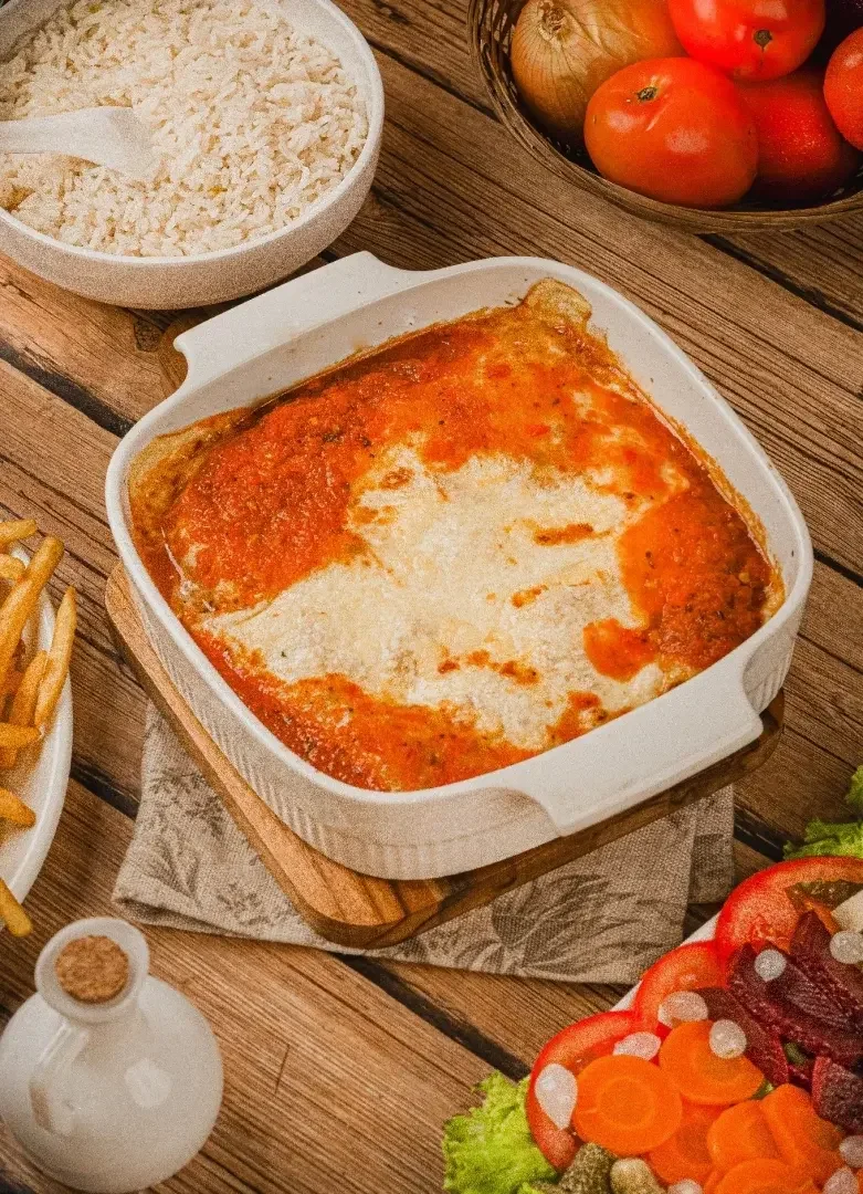 Filé de frango à milanesa, muçarela, molho, arroz branco, batata frita e salada.