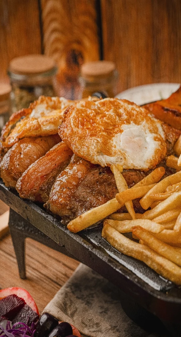 Picanha na chapa, salada, arroz branco, feijão tropeiro, ovo frito, mandioca frita, banana da terra frita e batata frita.
